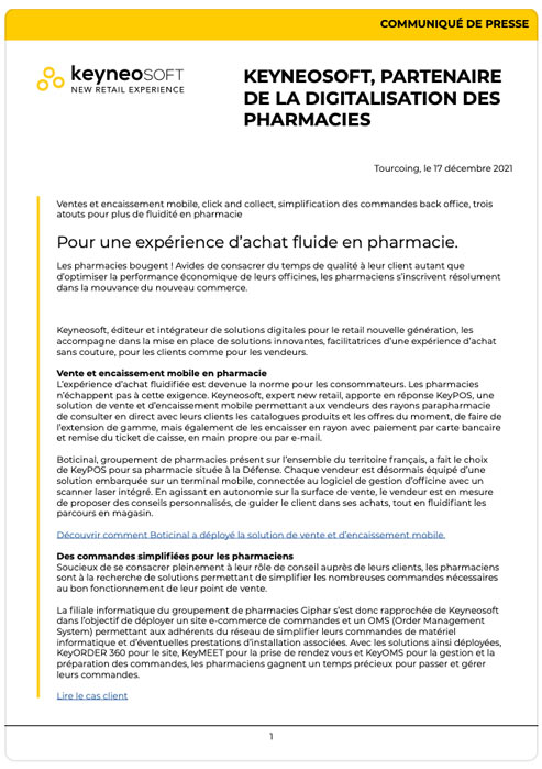 Les pharmaciens recherchent des solutions permettant de simplifier le fonctionnement de leur point de vente. Keyneosoft les accompagne dans la mise en place de solutions innovantes, facilitatrices d’une expérience d’achat sans couture, pour les clients comme pour les vendeurs.