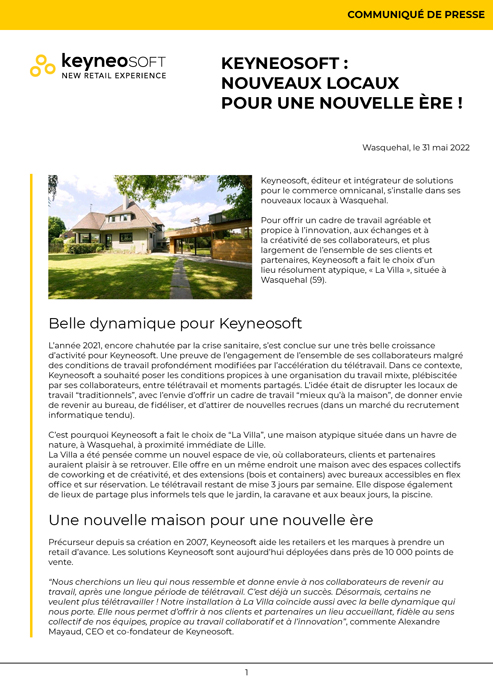 Pour offrir un cadre de travail agréable et propice à l’innovation, aux échanges et à la créativité de ses collaborateurs, et plus largement de l’ensemble de ses clients et partenaires, Keyneosoft a fait le choix d’un lieu résolument atypique, « La Villa », située à Wasquehal (59).